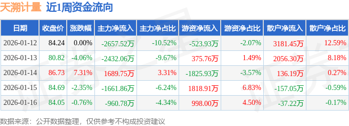 资金流向数据方面,本周天溯计量主力资金合计净流出6022.47万元,游资资金合计净流入842.81万元,散户资金合计净流入5179.66万元。本周资金流向一览见下表:
