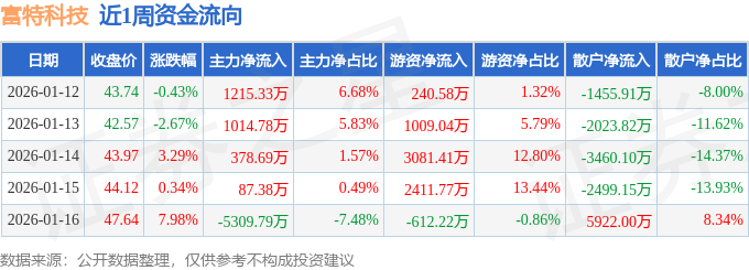 资金流向数据方面,本周富特科技主力资金合计净流出2613.6万元,游资资金合计净流入6130.59万元,散户资金合计净流出3516.99万元。本周资金流向一览见下表: