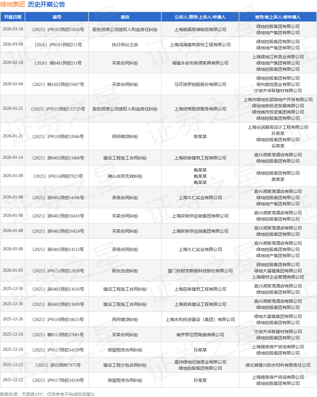 案号:(2025)沪0118民初32046号根据统计,近一年内以绿地控股集团有限公司为当事人的历史开庭公告有211则,其中案由为“建设工程施工合同纠纷”的公告以44则居首,其次为“金融借款合同纠纷”有24则,“合同纠纷”有18则。历史开庭公告(前20条)如下: