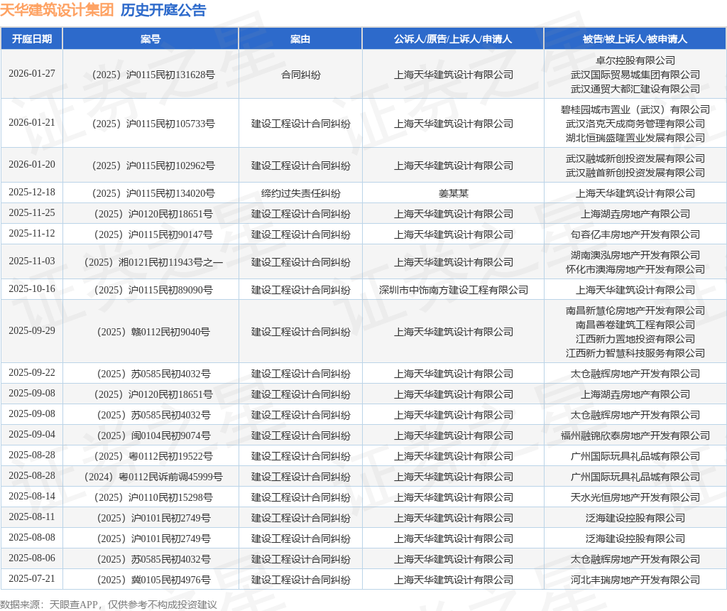 案号:(2025)沪0115民初105733号根据统计,近一年内以上海天华建筑设计有限公司为当事人的历史开庭公告有50则,其中案由为“建设工程设计合同纠纷”的公告以47则居首,其次为“合同纠纷”有2则,“缔约过失责任纠纷”有1则。历史开庭公告(前20条)如下: