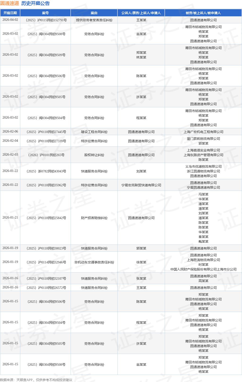 案号:(2025)沪0118民初25842号根据统计,近一年内以圆通速递有限公司为当事人的历史开庭公告有170则,其中案由为“快递服务合同纠纷”的公告以41则居首,其次为“特许经营合同纠纷”有23则,“财产损害赔偿纠纷”有15则。历史开庭公告(前20条)如下: