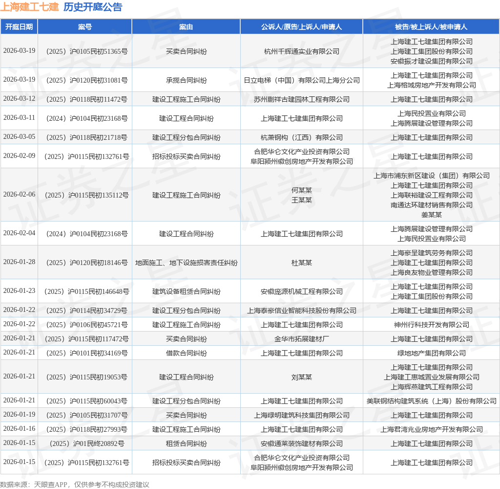 案号:(2025)沪0115民初117472号根据统计,近一年内以上海建工七建集团有限公司为当事人的历史开庭公告有219则,其中案由为“建设工程施工合同纠纷”的公告以49则居首,其次为“买卖合同纠纷”有36则,“建设工程分包合同纠纷”有36则。历史开庭公告(前20条)如下: