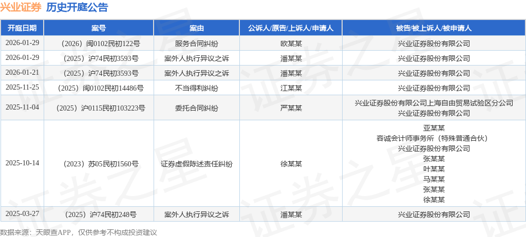 证券之星消息,根据天眼查APP显示,近日公布了一则兴业证券股份有限公司作为被告/被上诉人的开庭公告,详细内容如下: