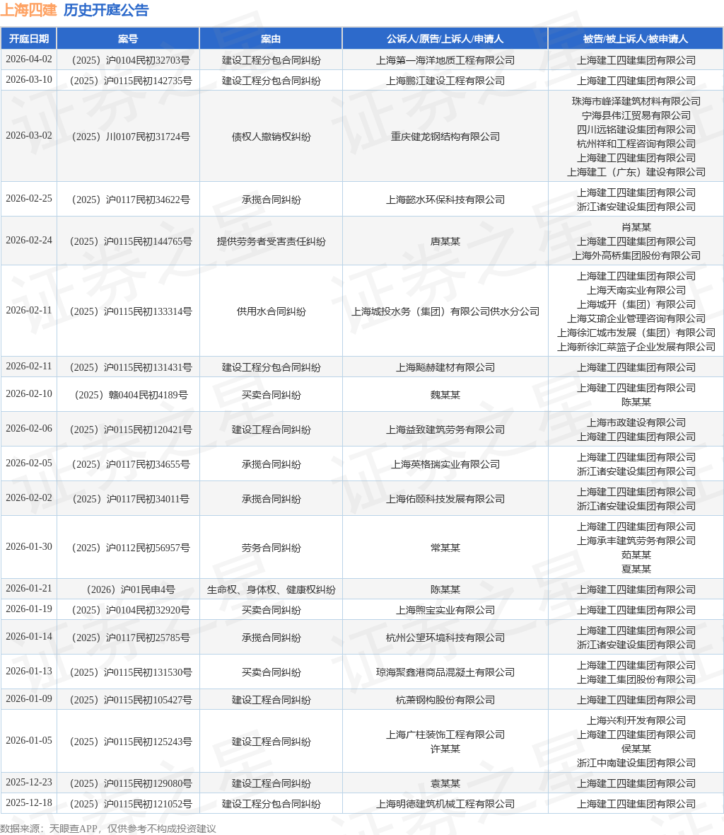 案号:(2026)沪01民申4号根据统计,近一年内以上海建工四建集团有限公司为当事人的历史开庭公告有129则,其中案由为“买卖合同纠纷”的公告以27则居首,其次为“建设工程分包合同纠纷”有25则,“建设工程合同纠纷”有14则。历史开庭公告(前20条)如下: