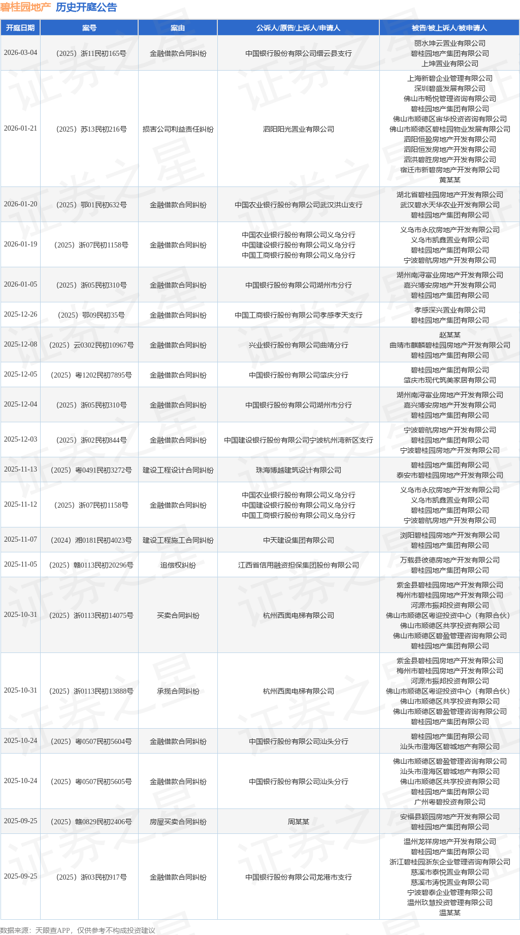 案号:(2025)苏13民初216号根据统计,近一年内以碧桂园地产集团有限公司为当事人的历史开庭公告有86则,其中案由为“金融借款合同纠纷”的公告以45则居首,其次为“建设工程施工合同纠纷”有6则,“股权转让纠纷”有4则。历史开庭公告(前20条)如下: