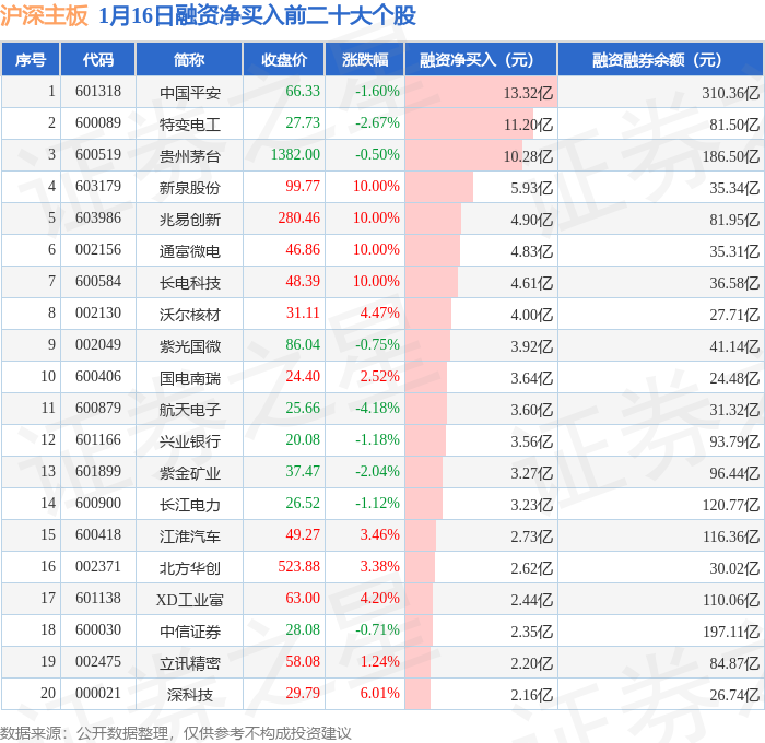 沪深主板融资净买入前三分别为:中国平安(601318)融资净买入13.32亿元、特变电工(600089)融资净买入11.2亿元、贵州茅台(600519)融资净买入10.28亿元,前20具体见下表:
