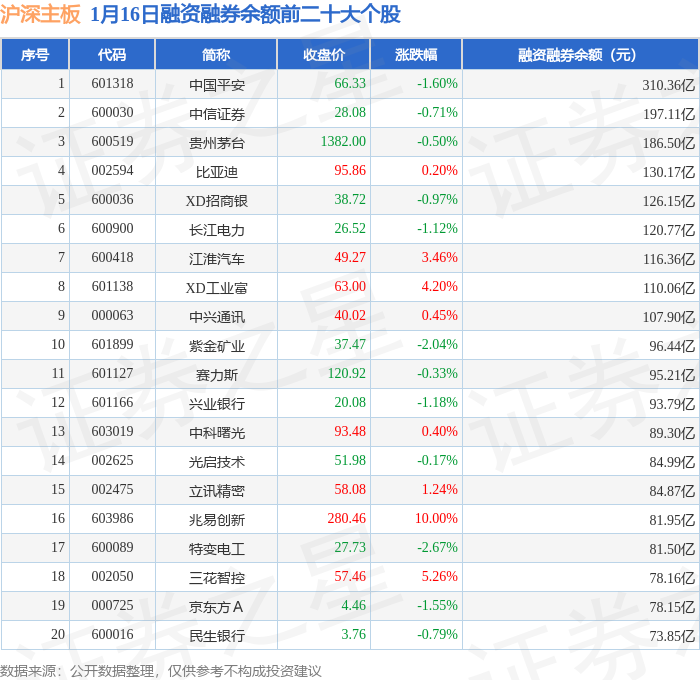 沪深主板融资融券余额前三分别为:中国平安(601318)融资融券余额310.36亿元、中信证券(600030)融资融券余额197.11亿元、贵州茅台(600519)融资融券余额186.5亿元,前20具体见下表: