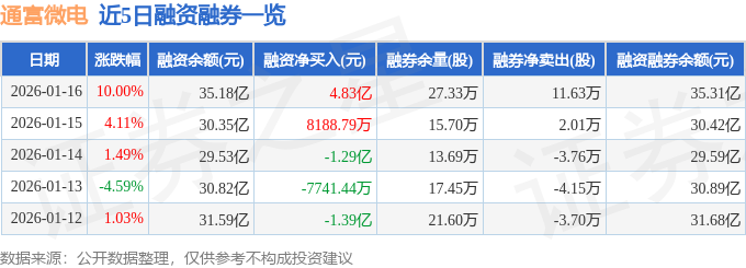 证券之星消息,截至2026年1月16日收盘,通富微电(002156)报收于46.86元,上涨10.0%,涨停,换手率11.71%,成交量177.71万手,成交额80.14亿元。