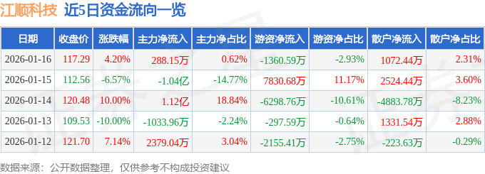 证券之星消息,截至2026年1月16日收盘,江顺科技(001400)报收于117.29元,上涨4.2%,换手率26.63%,成交量3.99万手,成交额4.64亿元。
