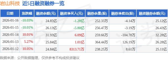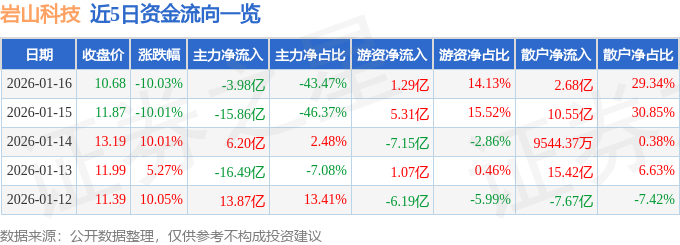 证券之星消息,截至2026年1月16日收盘,岩山科技(002195)报收于10.68元,下跌10.03%,已连续跌停2天,换手率1.53%,成交量85.65万手,成交额9.15亿元。