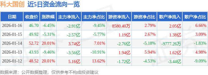 证券之星消息,截至2026年1月16日收盘,科大国创(300520)报收于46.7元,下跌6.45%,换手率22.67%,成交量63.03万手,成交额30.77亿元。