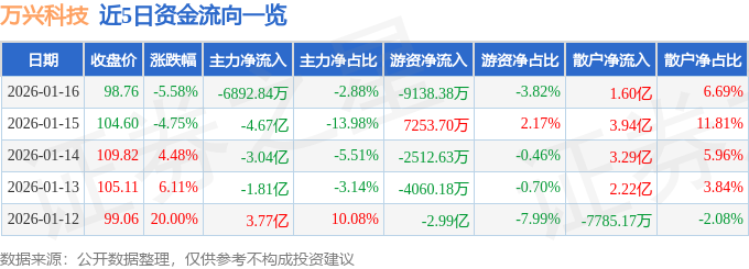 证券之星消息,截至2026年1月16日收盘,万兴科技(300624)报收于98.76元,下跌5.58%,换手率13.86%,成交量23.74万手,成交额23.95亿元。