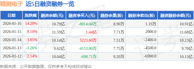 精测电子融资融券信息显示,融资方面,当日融资买入3.69亿元,融资偿还4.49亿元,融资净偿还8014.04万元。融券方面,融券卖出1.44万股,融券偿还2500.0股,融券余量8.9万股,融券余额1209.51万元。融资融券余额10.91亿元。