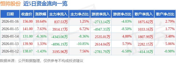 证券之星消息,截至2026年1月16日收盘,恒帅股份(300969)报收于156.0元,上涨10.64%,换手率8.83%,成交量4.44万手,成交额6.72亿元。