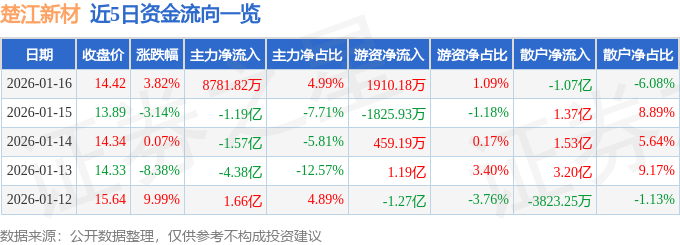 证券之星消息,截至2026年1月16日收盘,楚江新材(002171)报收于14.42元,上涨3.82%,换手率7.62%,成交量123.03万手,成交额17.59亿元。