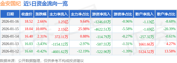 1月16日的资金流向数据方面,主力资金净流入1.25亿元,占总成交额9.64%,游资资金净流出1246.03万元,占总成交额0.96%,散户资金净流出1.13亿元,占总成交额8.68%。