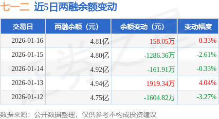 证券之星消息,1月16日,七一二(603712)融资买入7874.89万元,融资偿还7717.08万元,融资净买入157.81万元,融资余额4.81亿元。