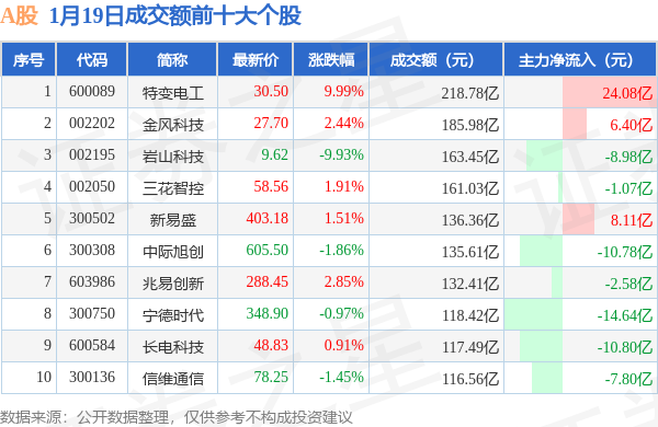 当日A股成交额前10大个股中6只个股收涨,平均涨幅3.27%,其中特变电工(600089)以成交额218.78亿元排第一。从主力资金流入看,成交额前10大个股中有3只个股呈现主力资金净流入。