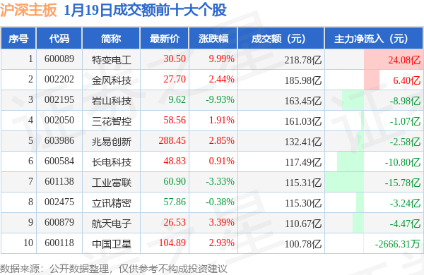 当日沪深主板成交额前10大个股中7只个股收涨,平均涨幅3.49%,其中特变电工(600089)以成交额218.78亿元排第一。从主力资金流入看,成交额前10大个股中有2只个股呈现主力资金净流入。