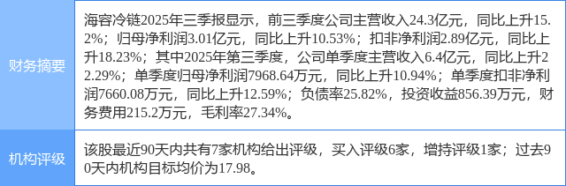 2025年11月5日,太平洋研究员孟昕,赵梦菲,金桐羽发布了对海容冷链的研报《海容冷链:2025Q3业绩双位数提升,内销冷藏柜快速增长》,该研报对海容冷链给出“买入”评级。证券之星数据中心根据近三年发布的研报数据计算,该研报作者对此股的盈利预测准确度为50.07%。