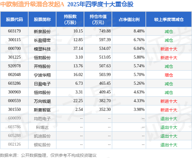 根据2025基金年报公募基金重仓股数据,重仓该股的公募基金共1家,其中持有数量最多的公募基金为中欧基金的中欧制造升级混合发起A。中欧制造升级混合发起A目前规模为0.35亿元,最新净值1.1619(1月16日),较上一交易日上涨6.47%。该公募基金现任基金经理为钟鸣。钟鸣在任的基金产品包括:中欧内需成长混合A,管理时间为2023年9月15日至今,期间收益率为79.38%;中欧盛世成长混合(LOF)A,管理时间为2025年2月20日至今,期间收益率为33.93%;
