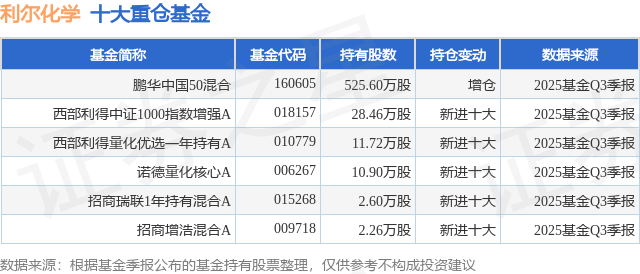 根据2025基金Q3季报公募基金重仓股数据,重仓该股的公募基金共6家,其中持有数量最多的公募基金为鹏华基金的鹏华中国50混合。鹏华中国50混合目前规模为13.56亿元,最新净值2.712(1月16日),较上一交易日下跌0.7%,近一年上涨58.41%。该公募基金现任基金经理为王云鹏。王云鹏在任的基金产品包括:鹏华新材料混合发起式A,管理时间为2023年3月28日至今,期间收益率为33.15%。