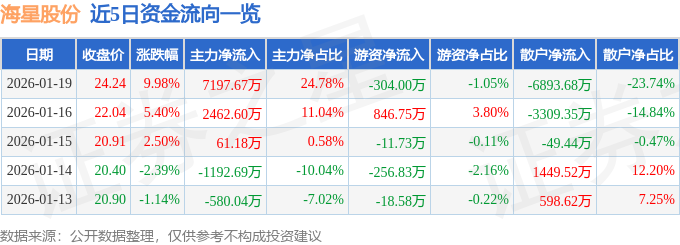 证券之星消息,截至2026年1月19日收盘,海星股份(603115)报收于24.24元,上涨9.98%,涨停,换手率5.21%,成交量12.6万手,成交额2.9亿元。