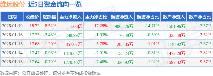 证券之星消息,截至2026年1月19日收盘,维远股份(600955)报收于18.72元,上涨8.52%,换手率6.08%,成交量33.45万手,成交额6.16亿元。