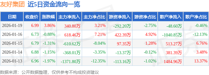 证券之星消息,截至2026年1月19日收盘,友好集团(600778)报收于6.99元,上涨3.86%,换手率4.96%,成交量15.44万手,成交额1.06亿元。