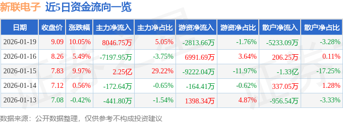 证券之星消息,截至2026年1月19日收盘,新联电子(002546)报收于9.09元,上涨10.05%,涨停,换手率23.0%,成交量184.26万手,成交额15.95亿元。