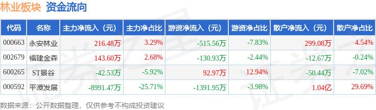 从资金流向上来看,当日林业板块主力资金净流出8673.92万元,游资资金净流出1945.47万元,散户资金净流入1.06亿元。林业板块个股资金流向见下表: