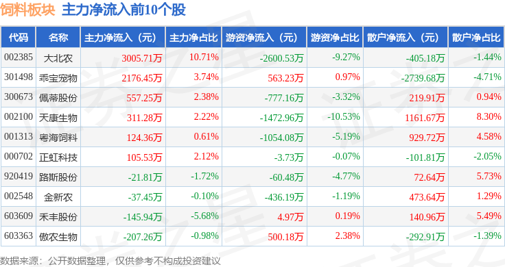 从资金流向上来看,当日饲料板块主力资金净流出4024.1万元,游资资金净流出1844.72万元,散户资金净流入5868.83万元。饲料板块个股资金流向见下表: