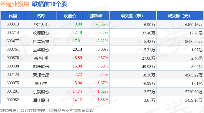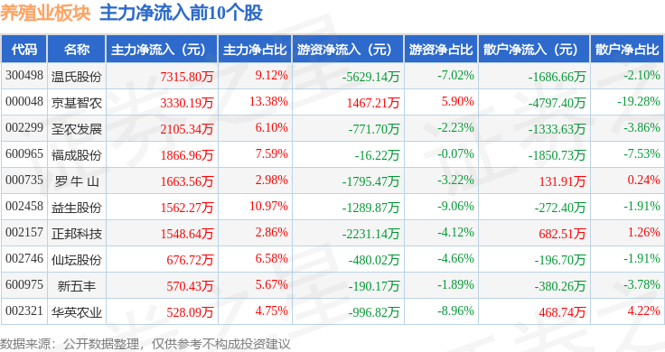 从资金流向上来看,当日养殖业板块主力资金净流入4039.29万元,游资资金净流出86.41万元,散户资金净流出3952.88万元。养殖业板块个股资金流向见下表: