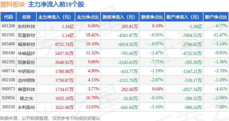 从资金流向上来看,当日塑料板块主力资金净流出6886.52万元,游资资金净流出1.43亿元,散户资金净流入2.12亿元。塑料板块个股资金流向见下表:
