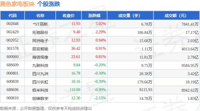 证券之星消息,1月19日黑色家电板块较上一交易日上涨0.44%,*ST高斯领涨。当日上证指数报收于4114.0,上涨0.29%。深证成指报收于14294.05,上涨0.09%。黑色家电板块个股涨跌见下表: