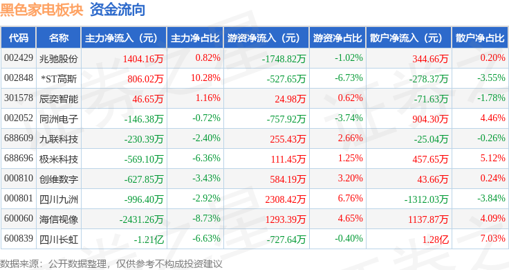 从资金流向上来看,当日黑色家电板块主力资金净流出1.48亿元,游资资金净流入815.82万元,散户资金净流入1.4亿元。黑色家电板块个股资金流向见下表: