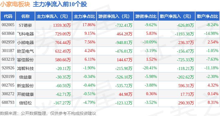 从资金流向上来看,当日小家电板块主力资金净流出9399.58万元,游资资金净流入1447.57万元,散户资金净流入7952.01万元。小家电板块个股资金流向见下表: