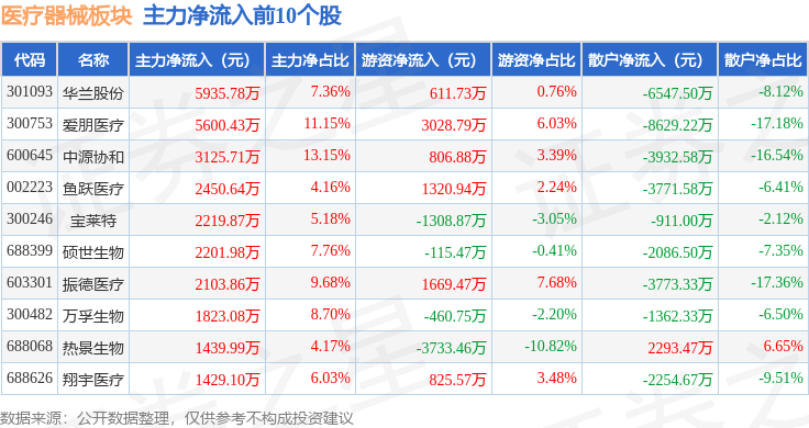 从资金流向上来看,当日医疗器械板块主力资金净流出6.07亿元,游资资金净流入5.15亿元,散户资金净流入9141.19万元。医疗器械板块个股资金流向见下表: