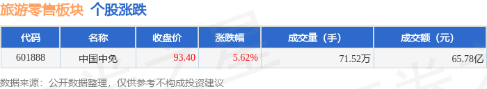 证券之星消息,1月19日旅游零售板块较上一交易日上涨5.62%,中国中免领涨。当日上证指数报收于4114.0,上涨0.29%。深证成指报收于14294.05,上涨0.09%。旅游零售板块个股涨跌见下表: