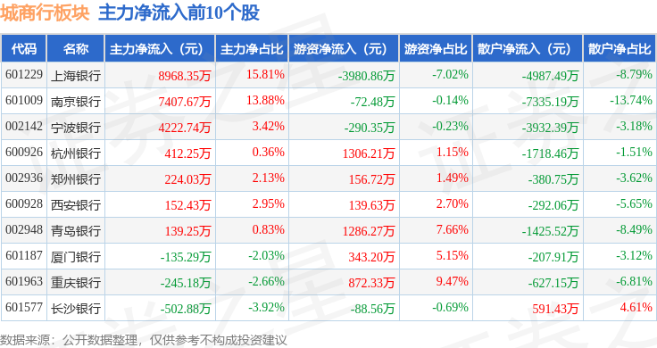 从资金流向上来看,当日城商行板块主力资金净流出1.99亿元,游资资金净流入2.46亿元,散户资金净流出4701.14万元。城商行板块个股资金流向见下表: