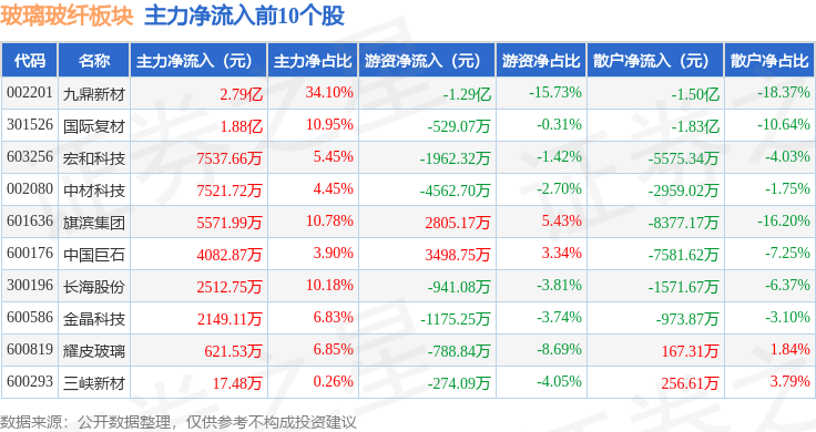 从资金流向上来看,当日玻璃玻纤板块主力资金净流入6.67亿元,游资资金净流出1.86亿元,散户资金净流出4.81亿元。玻璃玻纤板块个股资金流向见下表: