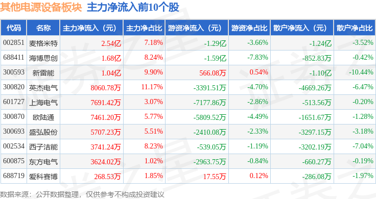 从资金流向上来看,当日其他电源设备板块主力资金净流入3.85亿元,游资资金净流出3.72亿元,散户资金净流出1350.83万元。其他电源设备板块个股资金流向见下表: