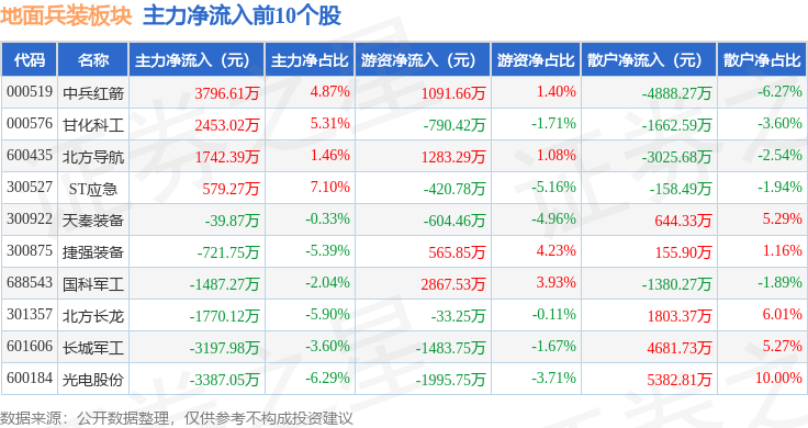 从资金流向上来看,当日地面兵装板块主力资金净流出1.97亿元,游资资金净流入6941.95万元,散户资金净流入1.27亿元。地面兵装板块个股资金流向见下表: