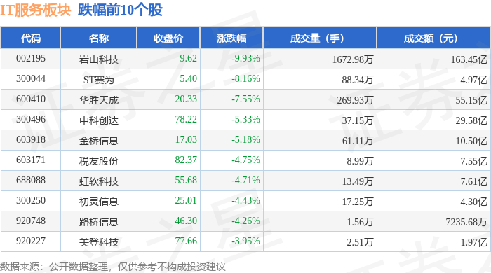 证券之星消息,1月19日IT服务板块较上一交易日下跌1.27%,岩山科技领跌。当日上证指数报收于4114.0,上涨0.29%。深证成指报收于14294.05,上涨0.09%。IT服务板块个股涨跌见下表:
