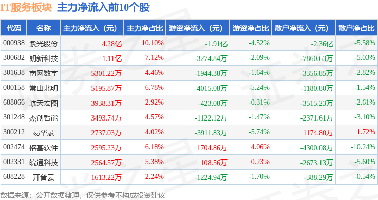 从资金流向上来看,当日IT服务板块主力资金净流出49.73亿元,游资资金净流入10.77亿元,散户资金净流入38.96亿元。IT服务板块个股资金流向见下表: