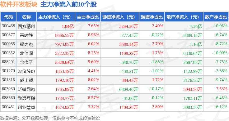从资金流向上来看,当日软件开发板块主力资金净流出58.7亿元,游资资金净流入20.87亿元,散户资金净流入37.83亿元。软件开发板块个股资金流向见下表:
