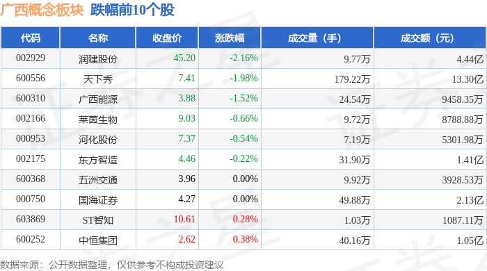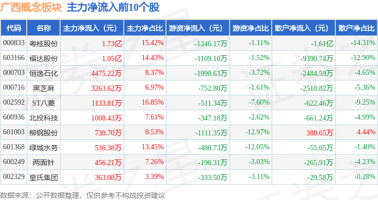 从资金流向上来看,当日广西概念板块主力资金净流入9502.81万元,游资资金净流出1.47亿元,散户资金净流入5223.61万元。广西概念板块个股资金流向见下表: