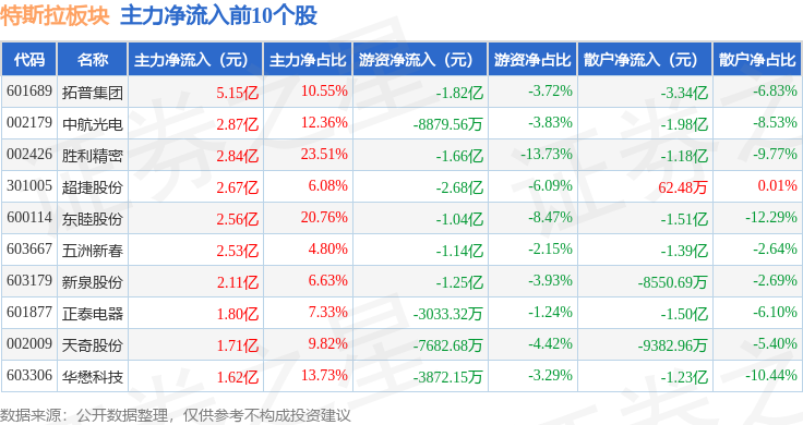从资金流向上来看,当日特斯拉板块主力资金净流出22.13亿元,游资资金净流入1.26亿元,散户资金净流入20.87亿元。特斯拉板块个股资金流向见下表: