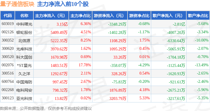 从资金流向上来看,当日量子通信板块主力资金净流出23.16亿元,游资资金净流入9.36亿元,散户资金净流入13.8亿元。量子通信板块个股资金流向见下表: