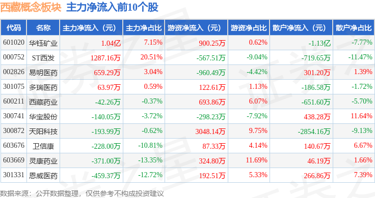 从资金流向上来看,当日西藏概念板块主力资金净流出2.08亿元,游资资金净流入3874.3万元,散户资金净流入1.69亿元。西藏概念板块个股资金流向见下表: